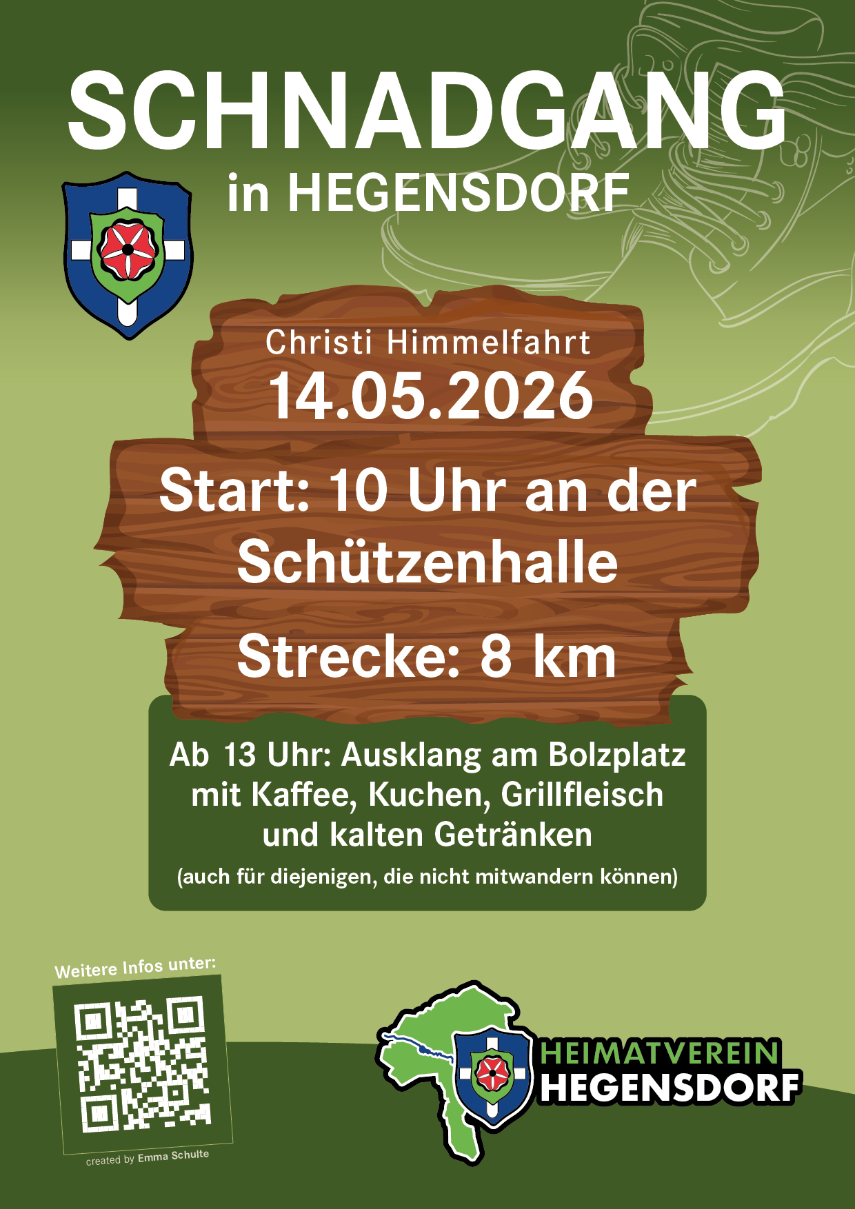 der traditionelle Schnadgang des Heimatvereins Hegensdorf findet in diesem Jahr am Donnerstag den 14. Mai statt. Um 10 Uhr startet die Wanderung an der Schützenhalle.